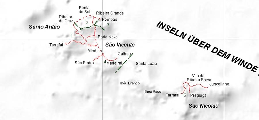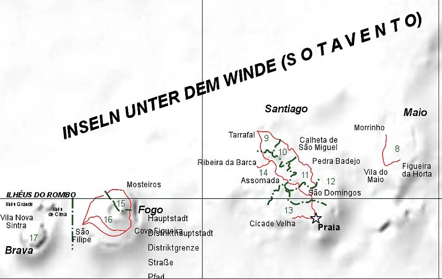 Von den 15 Kapverdischen Inseln, die sich in einer nördlichen Gruppe ("Inseln über dem Winde" - Barlavento) und einer südlichen Gruppe erstrecken ("Inseln unter dem Winde" - Sotavento) sind wie bereits erwähnt 9 bewohnt. Zu diesen bewohnten Inseln (siehe Karten oben) der nördlichen Gruppe gehören Santo Antão, São Vicente, São Nicolau (Barlavento NW) sowie Sal und Boa Vista (Barlavento NO). Die südliche Inselgruppe (Sotavento) umfasst Brava, Fogo, Santiago und Maio. Jede der Kapverden hat ihr eigenes Gesicht und übt einen besonderen Reiz auf Besucher aus. Welches der 9 Eilande das ideale Urlaubsziel ist, hängt davon ab, wie der Urlaub gestaltet werden soll.