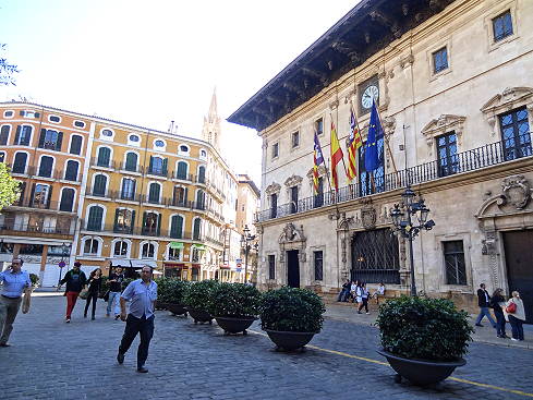Es geht vorbei an der berühmten Kathedrale und wir kommen in der Innenstadt von Palma an, man merkt, dass es noch früher Morgen ist, die Zahl der Fußgänger und Touristen hält sich in deutlichen Grenzen. Es bleibt nicht viel mehr als ein Rundgang: Ein kurzer Besuch in der Pfarrkirche des HL. Nikolaus von Bari mit anschließender Wein- und Kaffeepause auf der Plaça de Cort, dem verkehrsberuhigten Platz vor dem Rathaus von Palma, auf dem man einen mehrere hundert Jahre alten Olivenbaum bewundern kann. Schon bald darauf geht es wieder zurück Richtung Schiff, vorbei an inzwischen lästigen Straßenverkäufern ...
