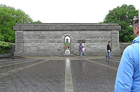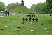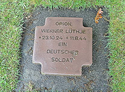 Mittlerweile hat es sich passend eingeregnet, als wir das Gelände betreten, das offiziell im Jahre 1961 als deutsche Kriegsgräberstätte eingeweiht wurde. Ein auffälliges Hügelgrab mit einem großen Kreuz auf dem Gipfel dominiert das Gelände, im Umfeld davon unzählige Gräber, überwiegend mit Grabsteinen für jeweils zwei deutsche Soldaten. Die halb im Rasen versenkten Platten enthalten zumeist Namen und Dienstgrad der dort bestatteten Gefallenen.