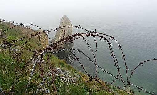 Das Geschehen hier im Zweiten Weltkrieg erscheint uns irgendwie vertraut: In den weltberühmten Filmen "Der längste Tag" und "Der Soldat James Ryan" wird mehr als eindringlich und stundenlang das erbarmungslose Gemetzel gezeigt, das sich an diesem Strand am 06. Juni 1944 abspielte. Unser Bus hält in der Nähe der Ortes Colleville-sur-Mer, an dessen Küstenabschnitt die Landung des V. US-Korps im Rahmen der Operation Neptune erfolgte, er ist mit rund 10 km Länge der ausgedehnteste Frontabschnitt der alliierten Landung.