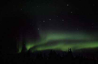 Am nächsten Tag soll es nun also losgehen. Wir sind aufgeregt und so schlafen wir recht unruhig in dieser kalten Nacht. Doch was für ein Glück - gegen 4 Uhr in der Nacht tanzen für uns die Nordlichter am Himmel. Grüne und manchmal ein paar rote Lichter bewegen sich wie eingefärbte Nebelschwaden über den gesamten Nordhimmel hinweg, verharren, bewegen sich langsam und dann wieder schnell, bis sie verschwinden und nichts hinterlassen als einen schwarzen Nachthimmel mit seinen Sternen ...
