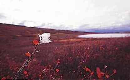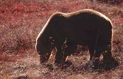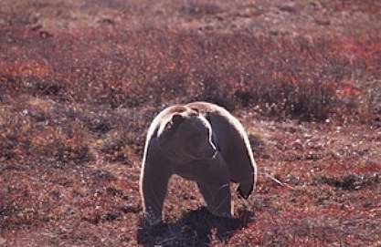 Schließlich entscheiden wir uns aus dem Tal hinauf zu steigen, um auf der "High Tundra" zu wandern. Hier wachsen Blaubeerbüsche und Moose, die jetzt im September in bunten Farben leuchten. Oben angekommen entdecken wir eine Grizzlymutter mit ihrem Jungen in etwa 1.000 m Entfernung. Zunächst erstarren wir. Sie scheinen uns aber nicht zu bemerken, und so legen wir unsere schweren Rucksäcke ab, um die beiden mit dem Teleobjektiv zu fotografieren - und um zu beobachten, welche Richtung sie einschlagen, denn wir wollen ihnen nicht in die Quere kommen. Die Bärin und ihr Kleines lassen sich viel Zeit beim Fressen der Blaubeeren. Auch ich bekomme Hunger, und so tue ich es den Bären gleich und "grase" auch ein bisschen nach Blaubeeren. Schließlich legt sich die Mutter auf den Rücken und säugt ihr Junges. Ein tolles Erlebnis!
