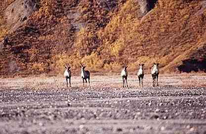 Nach einem steilen Abstieg von der Schotterstraße bis hinunter in das breite und steinige Flußbett, sehen wir eine kleine Herde Caribous. Zunächst laufen sie weg, als sie uns erblicken. Doch da wir uns ganz ruhig verhalten, kommen sie zurück. Caribous sind sehr neugierig. (Die Alaskaner sagen, sie seien dumm).