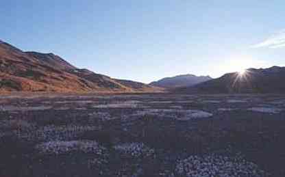 Am Wonder Lake Campground angekommen, bauen wir unser Zelt sozusagen "am Fuße des Mount McKinley" auf. Das Panorama ist einfach überwältigend! Bis es dunkel wird, sitzen wir zwischen Blaubeerbüschen und beobachten, wie die Sonne den Schnee des Mount McKinley manchmal orange einfärbt, dann wieder gelb oder rot bis hin zu Flieder- und Blautönen ...