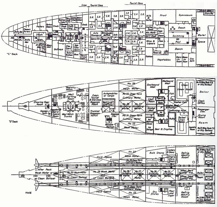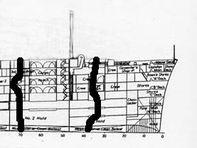 Aft, on both D and Hold Decks (see partial deck plans, below), the ship´s design featured numerous tanks that normally contained liquids. These tanks were probably deliberately empty when the ship went aground, to help reduce resistance during towing. In addition, the fuel oil settling tanks would likely have long before been pumped out (to recover valuable fuel oil).