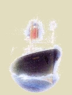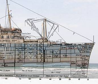 Still afloat in deeper waters, the severed stern section rotated slightly to starboard, with respect to the forward section, towards the shore. Two years after grounding, and aided by progressive and uneven flooding, the stern section rolled over and sank. Structural extensions added aft in 1964 to her Upper, Promenade and Sun Decks very likely contributed to an unstable condition that resulted in the loss of that portion of the ship. In addition, the vessel´s compartmentalization probably had just the opposite effect of what the designers intended, and helped contribute to the eventual demise of the stern section ...