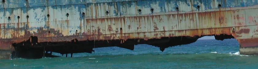This most recent and major destruction is the apparent result of the long, linear openings created by the sea along the waterline in way of the two forward cargo holds, and the greatly weakened condition of the ship's port side hull plating and interior support structures - exposed to the ravages of the sea for over thirteen years ...