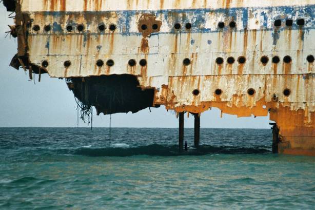 The result was a drastic and irreversible change in her appearance. The wreck assumed a list to port of about 30 degrees, allowing the sea to directly attack the superstructure on the port side because of this precarious position ...