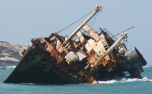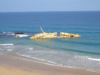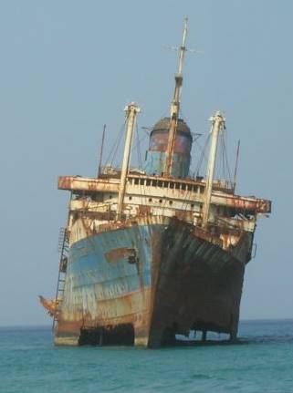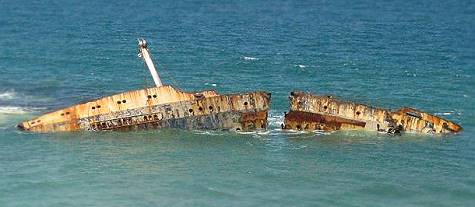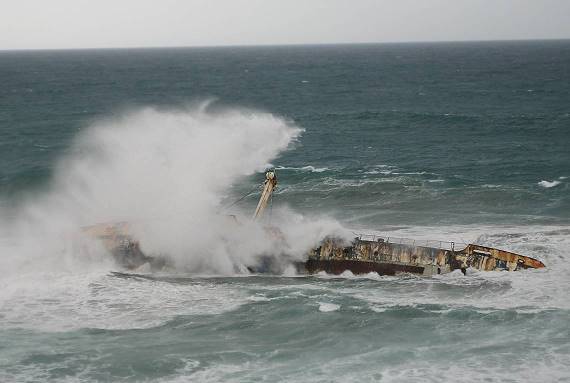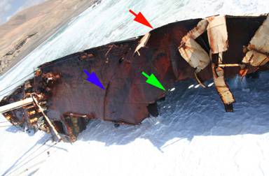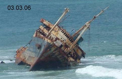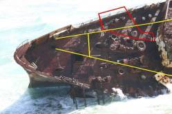 The portion of the ship’s bow that still resists destruction, over 16 years since the ship went aground is shown here, outlined in red. This photograph on the right below was taken on 24 February 2007.