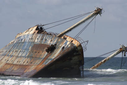 The hull section supporting the last surviving king post evidently collapsed before, or at the same time that this section of the broken bow disappeared from view. That change was first seen on the morning of 22 November 2007, and was undoubtedly due to the unremitting onslaught of wave action to the severely damaged structure. Other portions of the wreck, albeit unrecognizable, appear and disappear according to the whims of wind and tide.