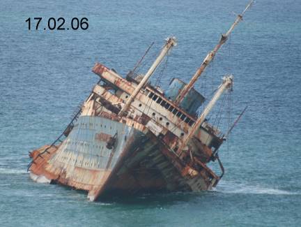 The pictures were taken at the beginning of April 2006. I have calculated that the wreck has apparently rolled even further to port (hull is now listing at an astounding 45 degrees). As a result, the vessel´s Upper Deck, which normally is about 40 feet above the water's level, is now right at sea level - on the port side.