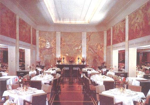 United States Lines spared no expense in replacing furniture, carpets and decorations in strict conformance with her original specifications. The shipbuilders of Newport News miraculously recreated her pre-war beauty. Pierre Bourdelle meticulously restored her First Class Dining Room murals to their original condition. The 26 lacquered Linoleum panels that defined this majestic space were his crowning achievement as an artist.