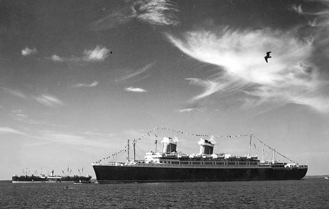 After disembarking her excited passengers in various ports of their "brave new world", the ship would carry passengers of opportunity (and sometimes homesick people returning to England) across the Pacific - retracing her wartime tracks. Return passages included exciting transits of the Panama Canal and occasional visits to Port Everglades. It was here that her wartime crew held a memorable reunion onboard "their" ship in 1975, and happily showed families where they once bunked, ate and stood watch.