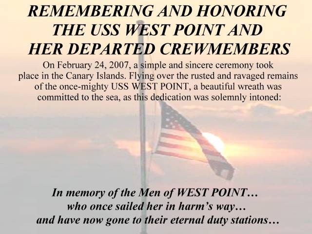 The reunion association started a new web site about the ship. Bill Lee has contributed a number of ideas, articles, photos and such to this project: www.usswestpoint.com.
