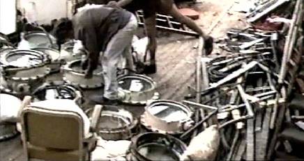 And now, we will deal with artist Klaus Berends who has a lot more to tell about the Greekīs activities in the film and who wants to go on board of the wreck with a film crew as part of an artistic event. Klaus Berends, already living on Fuerteventura for 15 years when the NDR documentary was created, took SS AMERICA artifacts for his exhibition by himself and turned those into art. This exhibition was shown later on in various European cities, for instance, in Germany in Bremerhavenīs "Deutsches Schifffahrtsmuseum" in 1998.