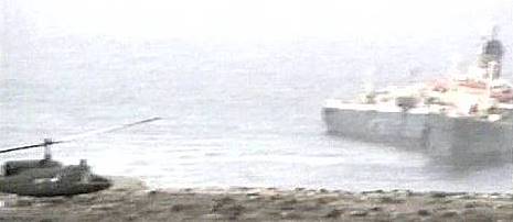 We see helicopters surrounding the ship during shooting exercises