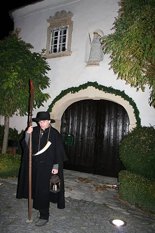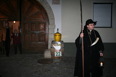 Um 16:30 Uhr soll die Blasmusikkapelle St. Lorenzen / Mürztal am historischen Kellerplatz aufspielen und schon um 18 Uhr ist ein Nachwächterrundgang angesetzt: "Auf den Spuren des Hl. Martin" ist das Thema des Rundgangs, der rund 2,5 Stunden dauern soll. In Anbetracht der Vielzahl von Weinkellern, die bereits am frühen Abend in der historischen Kellergasse von Purbach einladend beleuchtet sind, erwartet uns also wohl ein dichtes Programm, von dem wir keinen Punkt auslassen wollen ...