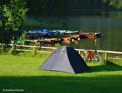 Die erste Nacht wollen wir auf dem Campingplatz verbringen und uns am nächsten Tag in Ruhe auf die Suche nach einem Schlafplatz abseits der anderen Camper umsehen. Der Zeltplatz liegt direkt am Gleinkersee, auf über 800 Metern Seehöhe. Neben einigen fixen Stellplätzen für Dauercamper sind auch wir mit unseren Zelten gern gesehene Gäste. Da wir außerhalb der Ferien und während der Woche ankommen, ist außer uns keiner vor Ort und wir haben freie Platzwahl. Natürlich wollen wir so nahe wie möglich ans Wasser.
