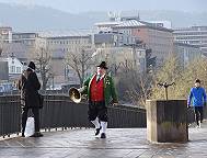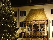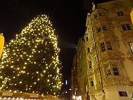 In der Abenddämmerung mit fantastisch beleuchteten Wolken und Nordkette in der untergehenden Sonne machen wir uns wieder auf den Weg durch die Altstadt: Um 17:30 Uhr finden wir uns beim Goldenen Dachl ein. Dort, wo - wie schon seit Jahrzehnten üblich - der riesige beleuchtete Weihnachtsbaum aufgestellt ist, der natürlich besucht werden muss, findet nun täglich um diese Zeit ein Blaskonzert statt. Die Amraser Turmbläser werden in Innsbruck zum Herzstück des Altstadtmarkts gezählt und unterhalten im Prunkerker des Dachls in der beginnenden Dunkelheit die Zuschauer mit einer Auswahl an traditionellen und stimmungsvollen Weihnachtsliedern. Auch derartige Aufführungen sind schon jahrzehntelange Tradition, wie das ehemalige "Innsbrucker Kindl" im Explorer Team zu berichten weiß ...