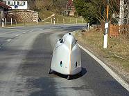 Gefährt, in dem schemenhaft bei der Vorbeifahrt ein einzelner Mensch
