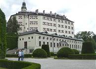 Enttäuscht verlassen wir aber bereits auch schon bei unserem Besuch das Zeughaus: Nun also weiter zum nächsten Ziel, das Schloss Ambras wird angesteuert. Diesmal müssen wir wieder in die Straßenbahn steigen, die bis zum südöstlichen Stadtteil Amras fährt, über dem dieses Schloss mit dem noch zusätzlichen "b" im Namen auf über 600 Meter Höhe und damit rund 100 Meter über dem Inntal liegt ...