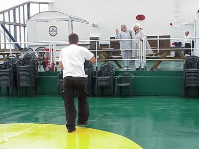 Am nächsten Morgen wachen wir bei trübem Wetter auf: Es regnet und leider gibt es auf der Fähre nur ganz wenige regengeschützte Plätze an Deck. Unter Deck ist es dagegen recht stickig, auf mehreren Fernsehern werden die Olympischen Spiele in Athen übertragen. Auch die Wettervorhersage ist mehr als trüb: Für die nächsten vier Tage ist zunächst "Leichter Regen", dann "Regen", weiter "Schauer" und zuletzt "Starkregen" angekündigt - tolle Aussichten, sollten diesmal die Wettergötter tatsächlich ..? Weit und breit sind auch nur Regenwolken zu sehen, die die Vorhersage zu bestätigen scheinen.