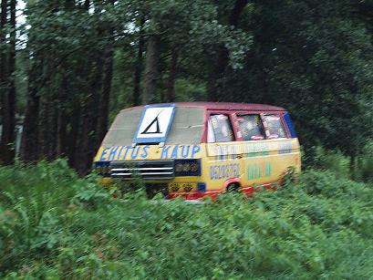 Während der Fahrt kommen wir an einem alternativen Campingplatz vorbei, dessen Beschilderung aus einem bunt bemalten ausrangierten VW-Bus besteht (N59.4407° E024.3737°). Die unerwartete Gelegenheit wird ohne zu Zögern sofort genutzt: Ein alter Russe präsentiert eine Tafel, auf der alle seine Dienstleistungen in estnischen Kronen und Euro aufgelistet sind. Wir nehmen das einfache Übernachtungsprogramm für 100,- EEK bzw. 7,- EUR. Der Russe akzeptiert Euros sowie auch estnische Kronen als Zahlungsmittel, er scheint sich auf den Tourismus bestens eingestellt zu haben.
