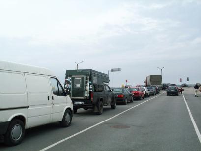 Zwei Autoschlangen warten auf die Fähre. Welche könnte die richtige sein? Die kürzere, die längere? Die eine Spur ist mit "Bron" gekennzeichnet. Wir fragen und haben Glück: Ein russischstämmiger Este erklärt uns mit russischer Wortgewalt, dass "Bron" von Autos genutzt wird, die vorreserviert haben, während wir uns hinter ihm in die längere Warteschlange einreihen müssen.