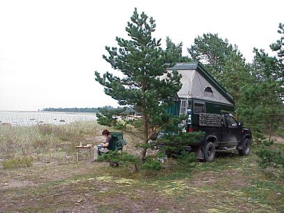 Ganz im Nordwesten auf der Halbinsel Köpu bei Kalana liegt das Surfer’s Paradise: Ein uriges Camp mit riesigen Tipis, einem alten PC an der Einfahrt und dem Hinweis, man betrete eine Webcamzone, die jedoch nicht immer online ist. Für Surfer ist es sicher optimal, denn der Wind fegt ungehemmt durch die Bucht. Wir fahren wieder ein Stückchen zurück und suchen uns am Ufer der Ostsee ein idyllisches Plätzchen, das auch noch windgeschützt liegt. Die ganze Region ist ein großer wilder Campingplatz für Windsurfer, Internetsurfer und Nichtsurfer.