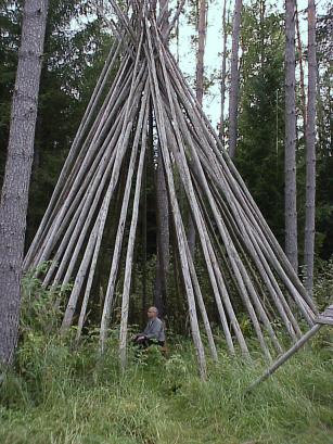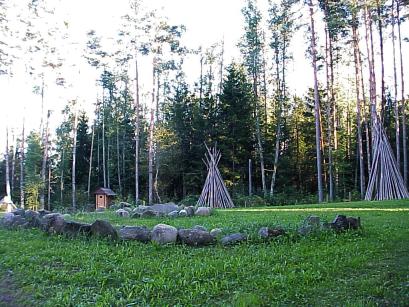 Tatsächlich findet sich am Ziel ein großes Gästehaus (Vidrik kivi turismitalu): Nach der englischen Frage nach Campingmöglichkeiten meint der Besitzer "Können Sie ein bisschen Deutsch?" Und schon gestaltet sich die Kommunikation deutlich einfacher: Eigentlich betreibt der Besitzer neben seinem Gästehaus keinen Campingplatz, aber nach kurzer Diskussion leitet er uns zu einem traumhaften Platz, auf dem seine private Sauna steht. Überall sind Holzpyramiden und Holztipis zu sehen. Er erklärt uns, dass bei diesen Pyramiden Abnormalitäten in der Erdstrahlung bestehen. Man soll sich an die gekennzeichneten Plätze setzen und meditieren. Eine Spirale aus großen Steinen gibt dem Ort etwas Magisches: Zu diesem Platz gehört ein Sumpf mit Flusssystem, das der Besitzer in einer Länge von zwei Kilometern selbst ausgebaggert hat ..!
