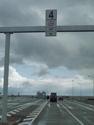 Im Hafen kaufen wir die Tickets zum Festland: Die Spur, in die wir eingereiht werden, zeigt deutlich, dass eine Höhenbegrenzung von 2 m besteht - für uns eindeutig zu wenig. Auch auf dem Ticket ist dies zu ersehen: Zu Fuß geht es zurück zum Schalter. Dort blickt die Dame zwangsläufig kurz vom Olympiaprogramm hoch, schaut auf unser Gefährt, winkt ab und macht deutlich, dass es letztlich egal ist. Ist es auch, denn die einige Zeit später erscheinende Fähre ist nach oben offen ...