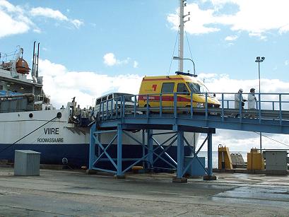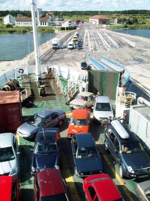 Laut Fahrplan gibt es eine Fähre um 12:00 Uhr und für diese Fähre wären wir pünktlich da. Aber an der Zeit 12:00 Uhr ist ein Symbol zu erkennen, das im Fahrplan estnisch erläutert wird. Wir ahnen nichts Gutes und haben Recht: Die Fähre fährt nicht. Also getreu dem Motto "Reise in die Langsamkeit" warten wir auf die 13:00 Uhr-Fähre, auf der wir tatsächlich noch mitkommen. Die Fähre wird auf zwei Etagen angefahren: Für das obere Deck werden die Fahrzeuge über eine Rampe geleitet, es wird dicht gepackt und nicht alle kommen mit. Die Zurückbleibenden müssen eine Stunde warten, bis zur nächsten Fähre ...