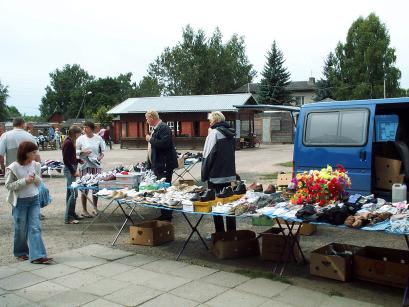 Im Supermarkt sind wir die Einzigen, die einen Einkaufswagen füllen: Die meisten haben ein Körbchen mit nur zwei bis drei Grundnahrungsmitteln, was irgendwie die Armut der Region deutlich macht. Das Gemüseangebot beschränkt sich im Wesentlichen auf Produkte der Region (Kartoffeln, Kohl, Zwiebeln, Äpfel). Als Fisch gibt es Salzheringe und gelblich fetten Lachs, das Fleischangebot ist reduziert auf Hühnerteile. In der Tiefkühltruhe liegen verschiedenartigste Sorten Hackfleisch. Wir erinnern uns an Berichte über die baltische Weinkultur, als im Weinregal die Weiß- und Rotweine aus uns unbekannten Weinanbauregionen wie Moldawien oder Georgien zu sehen sind: Auf allen Etiketten ist entweder ein atemberaubender Restzuckergehalt vermerkt oder aber der Zusatz "Süßwein". Wir verzichten auf eine "Weinverkostung" ...