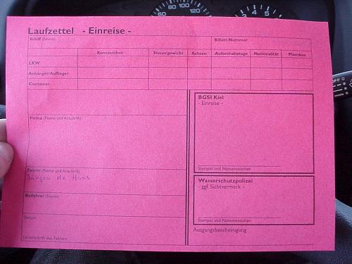 Am nächsten Tag wird Kiel pünktlich ereicht. Die deutsche Bürokratie erwartet uns schon gierig: Jeder hatte bereits in Klaipeda einen roten "Laufzettel" erhalten: "Für Deutschland". Wer keinen LKW einführt, muss nur den Namen des Fahrers eintragen. Der Zettel wird bei der Einreise vom BGS abgestempelt. Dann rollt man 40 Meter weiter, dort sammelt der Zoll den Zettel wieder ein. Das Zollbüdchen ist so konstruiert, dass der Zöllner rauskommen muss, um den begehrten Laufzettel zu bekommen, denn der Schalter befindet sich in LKW-Cockpit-Höhe. So lange Arme hat keiner!