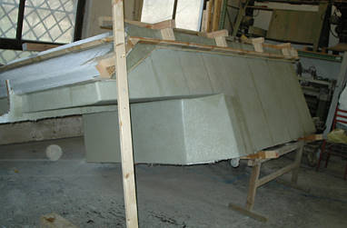 Es wurden zunächst alle Versteifungen mit anlaminiert, bevor ich unten weiter machen konnte. Jedes Einzelteil (Dach und die Seiten) erforderte ca. zwei Wochen, bis dann der entscheidende Tag kam, an dem alles ausgeformt wurde (Bilder unten).