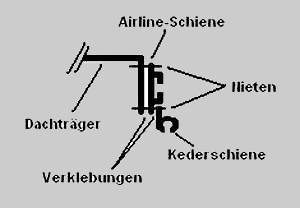 Die 1.250 mm langen Airline-/Kederschienen werden seitlich am Dachträger verklebt/vernietet, die kürzere 1.000 mm Schiene hinten (Bild 3, unten).