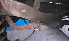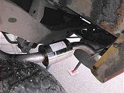 Wie erhofft passte jedoch der Hauptstrang trotz des großen Mitteltopfes platzmäßig wunderbar und mein Schweißer-Kumpel und ich mussten nur neue Halterungen bauen, damit er aufgehängt werden konnte. An meinem neuen feuerverzinkten Chassis war das kein Problem und in kürzester Zeit war der Hauptstrang mit dem voluminösen Mitteltopf und dem Endtopf eingebaut. Ganz hinten beim Endtopf brauchte es nur eine Stange mit Schrauböse als Aufhängung. Im Gegensatz zum Tdi hat der Abgasstrang des TD5 drei statt nur zwei Aufhängepunkte. Er ist etwas schwerer und asymmetrischer - der Preis des großen Mitteltopfes. Auch diese dritte Halterung war einfach herstellbar, weil am neuen verzinkten Chassis genügend vorbereitete Löcher sind, um sie zu verschrauben.