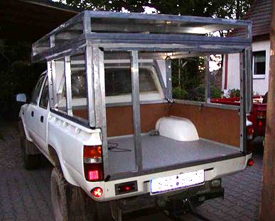 Die kleinen Kabinen, die es zu kaufen gab, gefielen uns nicht und eine große wollten wir unserem "Dicken" nicht zumuten, mit seinen 80 PS. Also auf dem 2005er Buschtaxi-Treffen noch ein paar Anregungen geholt und dann zur Planungsphase übergegangen. Wobei es eigentlich keinen richtigen Bauplan der Kabine gab: Wir legten nur grob fest, wie es werden sollte und was wir haben wollten ...
