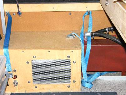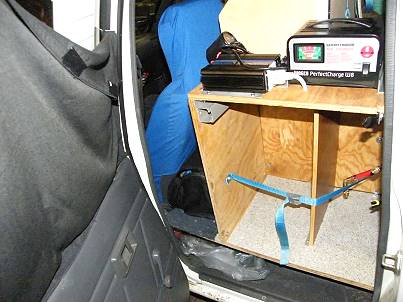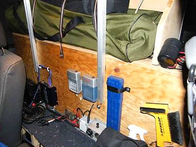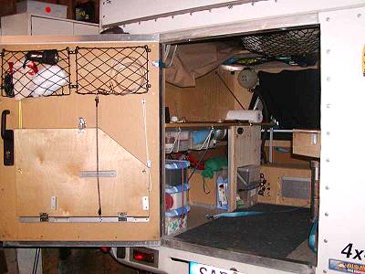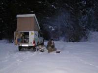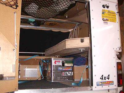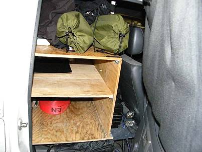 Im Januar 2006 ging es dann los: Als erstes flog die hintere Sitzbank heraus. Dort wurde eine große Staubox aus Holz eingebaut, welche die Aufgabe hatte, 2x20 Liter Wasserkanister mit Tauchpumpe und Heizstab, Reservekanister, Werkzeug, Bergematerial, 1x 85Ah Batterie, Stühle, Tisch, Nahrungsmittel und Getränke aufzunehmen, also eigentlich alle schweren Sachen. Die Heckscheibe wurde ebenfalls entfernt, als Notdurchgang und für die Durchführung der Strom- und Wasserleitungen.