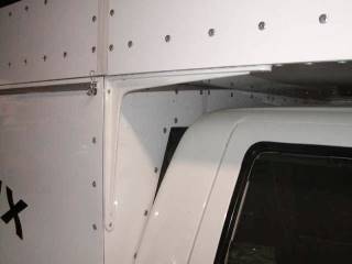 Aufgestellt wird das Dach mit Muskelkraft, und gehalten mit einfachen, höhenverstellbaren Alurohren mittig und hinten. Die Kabine liegt nur auf der Bordwand auf ist mit der Ladefläche an sechs Punkten mittels Spannschrauben befestigt und somit "Ladung". Die Außenbeplankung besteht aus 1,5 mm pulverbeschichtetem Alublech: Teuer, aber spart das Lackieren und außerdem mag ich Riffelblech nicht so. Die Beplankung wurde geklebt und genietet (ca.600 St.).