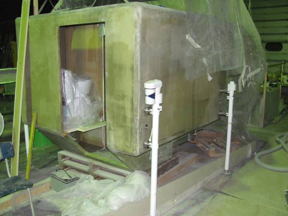 Außerdem haben wir ein weiteres kleines Dilemma für uns gelöst: Einerseits so leicht wie möglich - das heißt, möglichst wenig Harz, Spachtel, Farbe. Und bedingt eine wellige Oberfläche. Andererseits so "schön" wie möglich - denn "den Kunden" verlangt es nach einer glatten, glänzenden Oberfläche. Und so machen wir die Rückseite der Kabine glatt und glänzend, während die Masse der Oberfläche rau und super-leicht bleibt: Denn auf einem Quadratmeter Oberfläche kommen schnell 1 kg Lack und zusätzlich bis zu 1,5 kg Spachtel zusammen - das sind schon bei einer kleinen Kabine von etwa 20 qm Oberfläche zusätzliche 30-50 kg. Sparsamkeit diesbezüglich lohnt sich also!