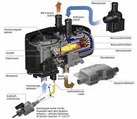 Am Beispiel einer Airtronic von Eberspächer erkennt man die Funktionsweise (Bild links): Eine Dosierpumpe spritzt Kraftstoff in eine Brennkammer, in der dieser kontrolliert verbrennt. Ein Luftgebläse saugt kalte Luft an, diese erwärmt sich an den heißen Außenwänden der Brennkammer und strömt als Warmluft in den Innenraum des Wohnmobils.