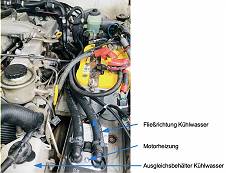 Aufgrund der Gegebenheiten im Motorraum musste die Motorheizung relativ hoch installiert werden (Bild oben links). Die Oberkante der Schläuche befindet sich etwas oberhalb der Maximalmarkierung des Ausgleichsbehälters. Dies entspricht zwar nicht den Vorgaben des Herstellers, funktioniert aber bei guter Entlüftung der Schläuche, da es ein geschlossenes System darstellt.