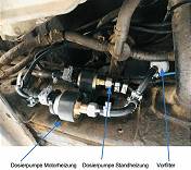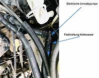 Die elektrische Umwälzpumpe (Bild oben rechts) wird in Fließrichtung des Kühlwassers vor dem Brenner installiert. Die Fließrichtung ist leicht zu erkennen, und zwar anhand des Temperaturanstiegs vor und nach dem Wärmetauscher der Heizung des Innenraums. Die Fließrichtung muss zwingend beachtet werden, weil ansonsten die Wasserpumpe des Motors und die Umwälzpumpe entgegengesetzt arbeiten.