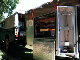 Im hinteren Bereich bis zum Rolltor ist Platz für Stühle, Waschzeug, Werkzeugkasten, Stapelboxen, usw., je nach Bedarf. Vor diesem vollständig durch eine Wand getrennten Bereich wird die Kühlbox samt 11 kg Gasflasche, 20 Liter Wasserkanister und 20 Liter Reservekanister aufbewahrt. In separaten Staufächern finden die Zusatzbatterie, eine große Coleman Lampe, Zeltleinen und Heringe sowie weitere Boxen Platz. Diese Abteilung wird von vorn erreicht durch die nach oben zu öffnende Klappe. Die Be- und Entlüftung der gasbetriebenen Kühlbox ist so angeordnet, dass die Flamme während der Fahrt nicht ausgeblasen wird. Natürlich ist zusätzlich eine 12 Volt Versorgung vorhanden, man weiß ja nie ...