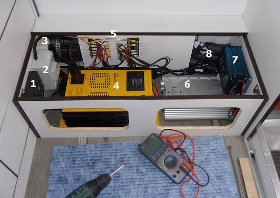 Im Bild unten links sind die Anschlüsse der Solarpanels im Solarregler zu erkennen. Daneben befindet sich der FI-Schutzschalter und die Landstrom-Steckdose.