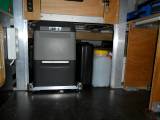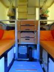 Unter dem linken Bett befinden sich zwei Staukästen (Bild 2, siehe Bildreihe unten von links nach rechts). Unter dem rechten Bett ist ein weiterer Staukasten untergebracht, daneben ist Platz für die Toilette (Bild 3). Nach vorne zur Fahrerkabine hin wurde ein Schubladenblock eingesetzt (Bild 4). Somit gibt es 4 Schubladen vorne sowie links und rechts je zwei Ablagefächer. Darunter ist noch genügend Platz für die Stromversorgung samt Akkus (Bild 5) und für Kühltasche, Gaskocher, Wasserkanister sowie viele andere brauchbare Dinge (Bild 6). Aus dem Schubladenblock kann man einen dort untergebrachten Tisch herausziehen.