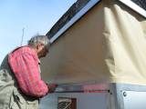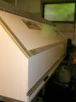 Die Seitenteile werden mit je 5 Riegeln (2 vorne, 2 hinten, 1 in der Mitte) (Bild 8) unter der aufgeklappten Liegefläche verriegelt (Bild 11) und zusätzlich von außen mit weiteren Riegeln gesichert. Alle Kunststoffteile der Verriegelung wurden selbst gefräst. Das Oberteil der Klappen überlappt das Unterteil sowie die Seitenflügel, sodass ein Ausklappen auch bei Regen möglich ist, ohne dass dabei Wasser ins Innere gelangen kann. Die zweigeteilten Seitenklappen haben keine Fenster zum Öffnen, da die Schräge dem Regen ausgesetzt ist (Bild 9).