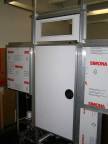 Nach Montage des Unterbaus (Bild 17, siehe Bildreihe unten von links nach rechts) sieht man bereits die Frontplatte und ein Seitenteil mit Ausstellflügel (Bild 18).An dem Alu-Z-Profil wurde die Zeltplane mittels Aluleiste und Nieten befestigt (Bild 19), ebenso am Dachrand. Und fertig (Bild 20)!