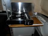 Die Matratzen sind geteilt (50/30 cm), um sie im Fahrbetrieb bei eingeklappten Seitenteilen verstauen zu können. Stauraum gibt es zusätzlich auch am Fuß- und Kopfende der Liegeflächen (Bild 15). An der linken hinteren Wand befindet sich eine ausklappbare Konsole für den Gaskocher mit Spritzschutz (Bild 16).
